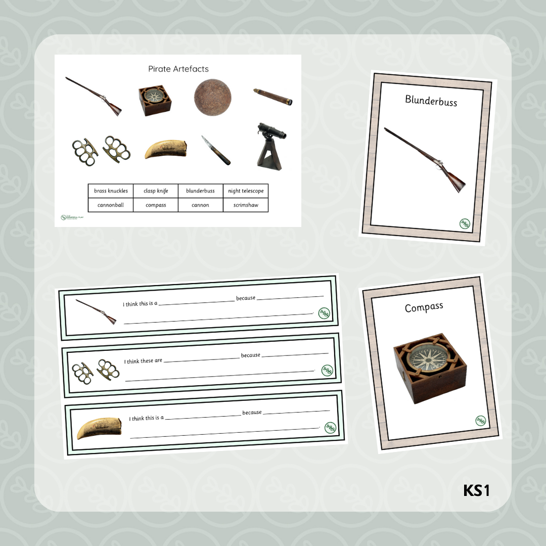 A set of pirate artefact flashcards, sentence strips to write a prediction and artefact mat with word bank.