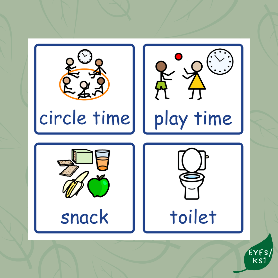 A set of schedule symbols that can be used for timetables, now and next boards or other visual aids. Available in both black and blue to support all learners.
