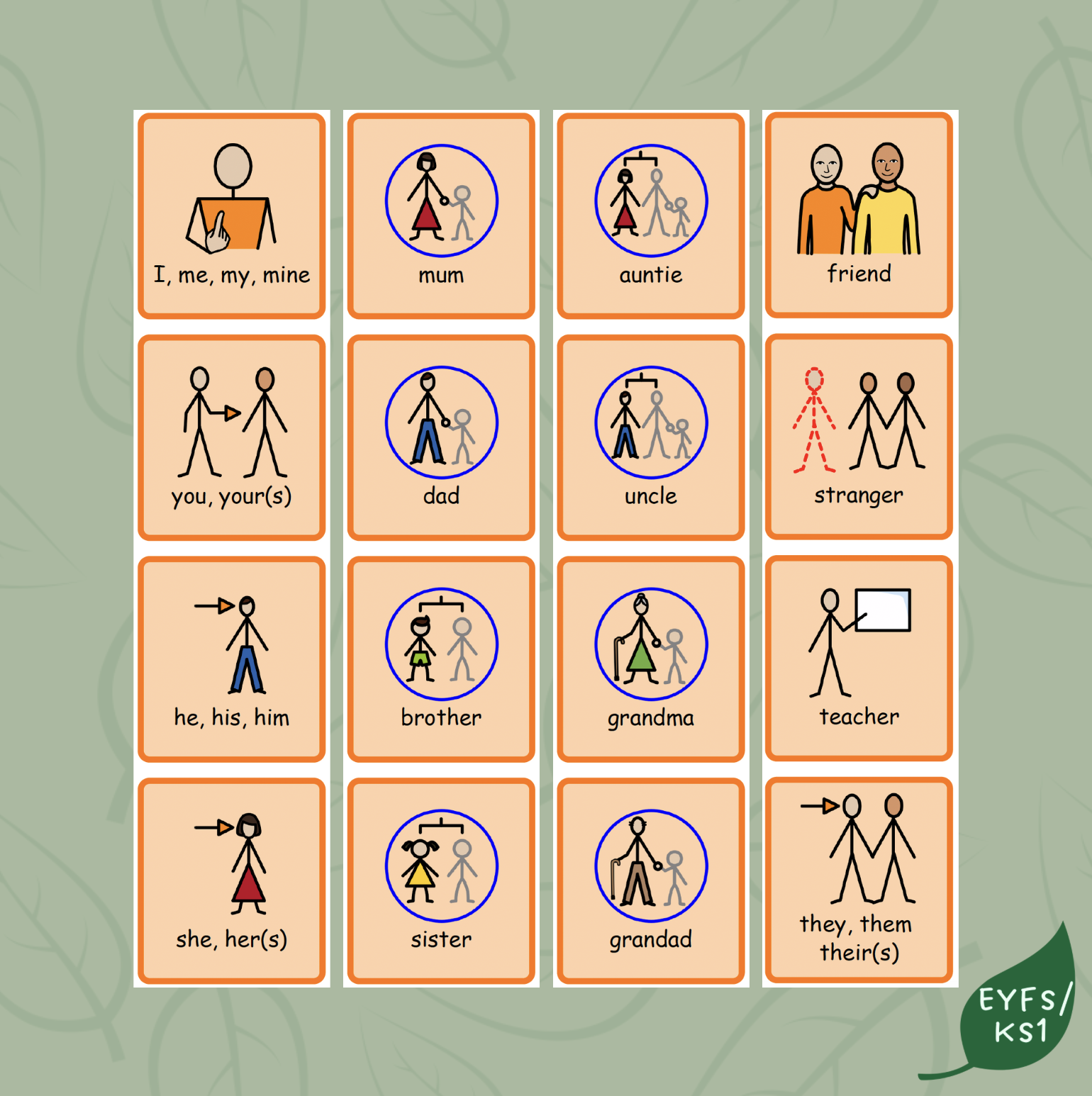 12 symbols of the 'What doing' stage of the Colourful Semantics approach. Use this to identify what a person is doing in a picture e.g. playing, looking.