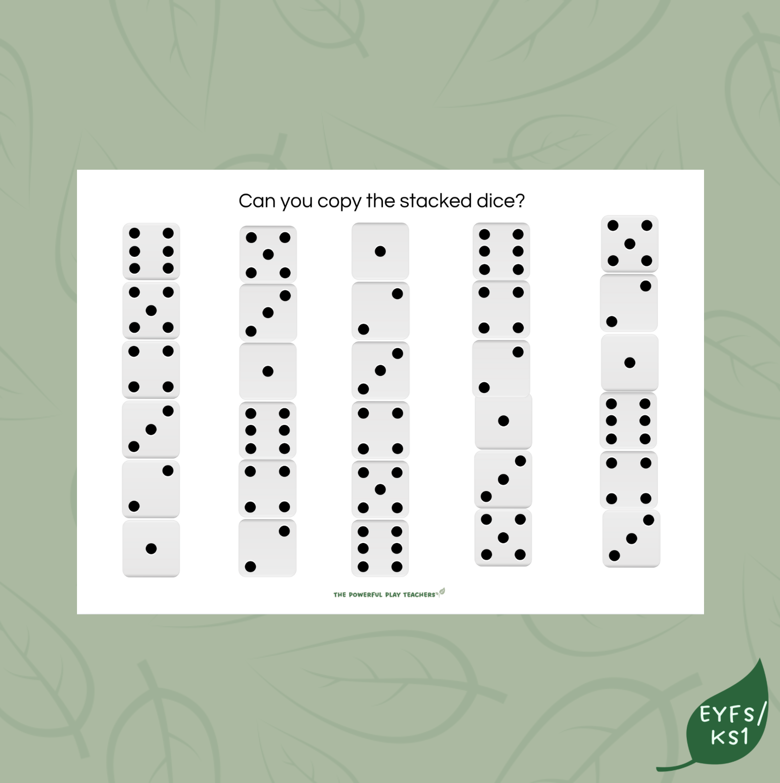 Develop motor skills, subitising, number recognition and more with this simple but engaging dice stacking resource. Children can either match the dice stacks with physical resources or use numbered digit dice to demonstrate their representation skills. Why not challenge children to add the total as they go for older learners?