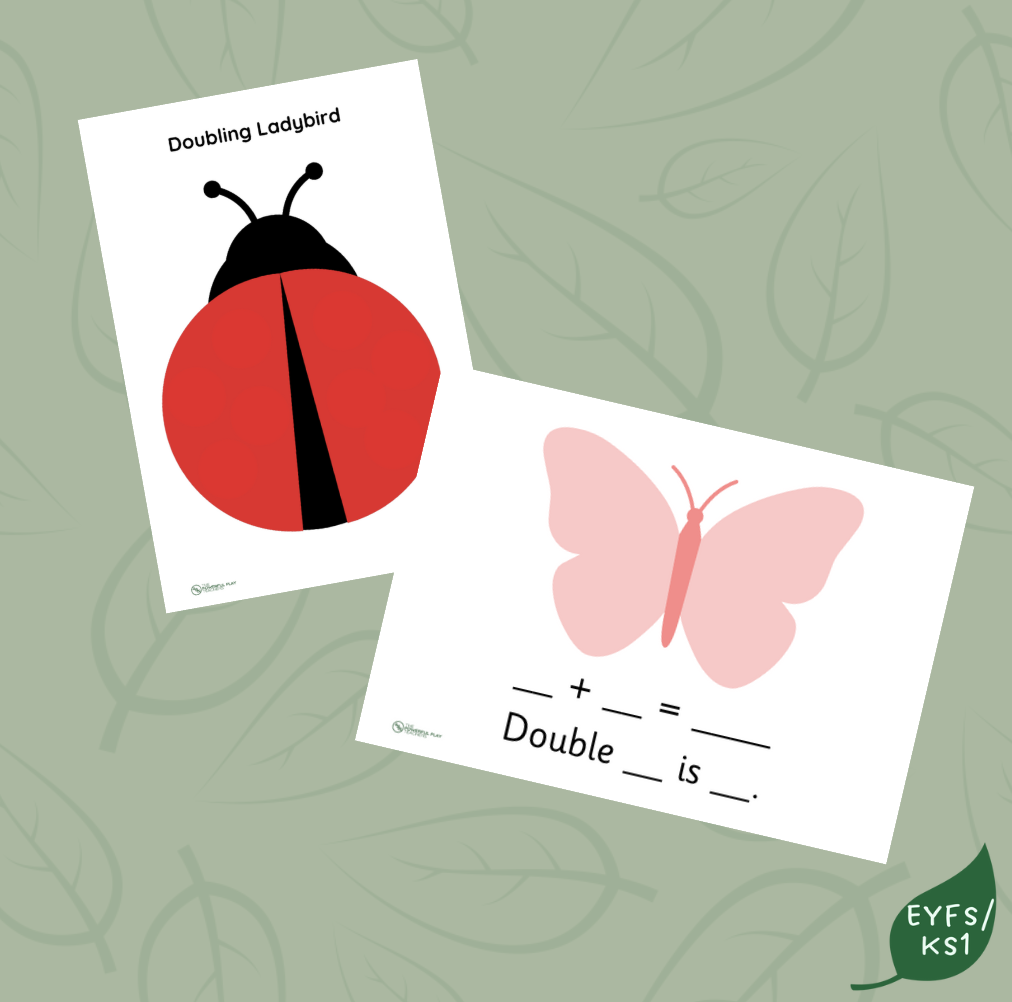A template of a ladybird and butterfly to represent doubles. Place physical objects or draw the same amount on each side to represent a double. Includes templates with stem sentences.