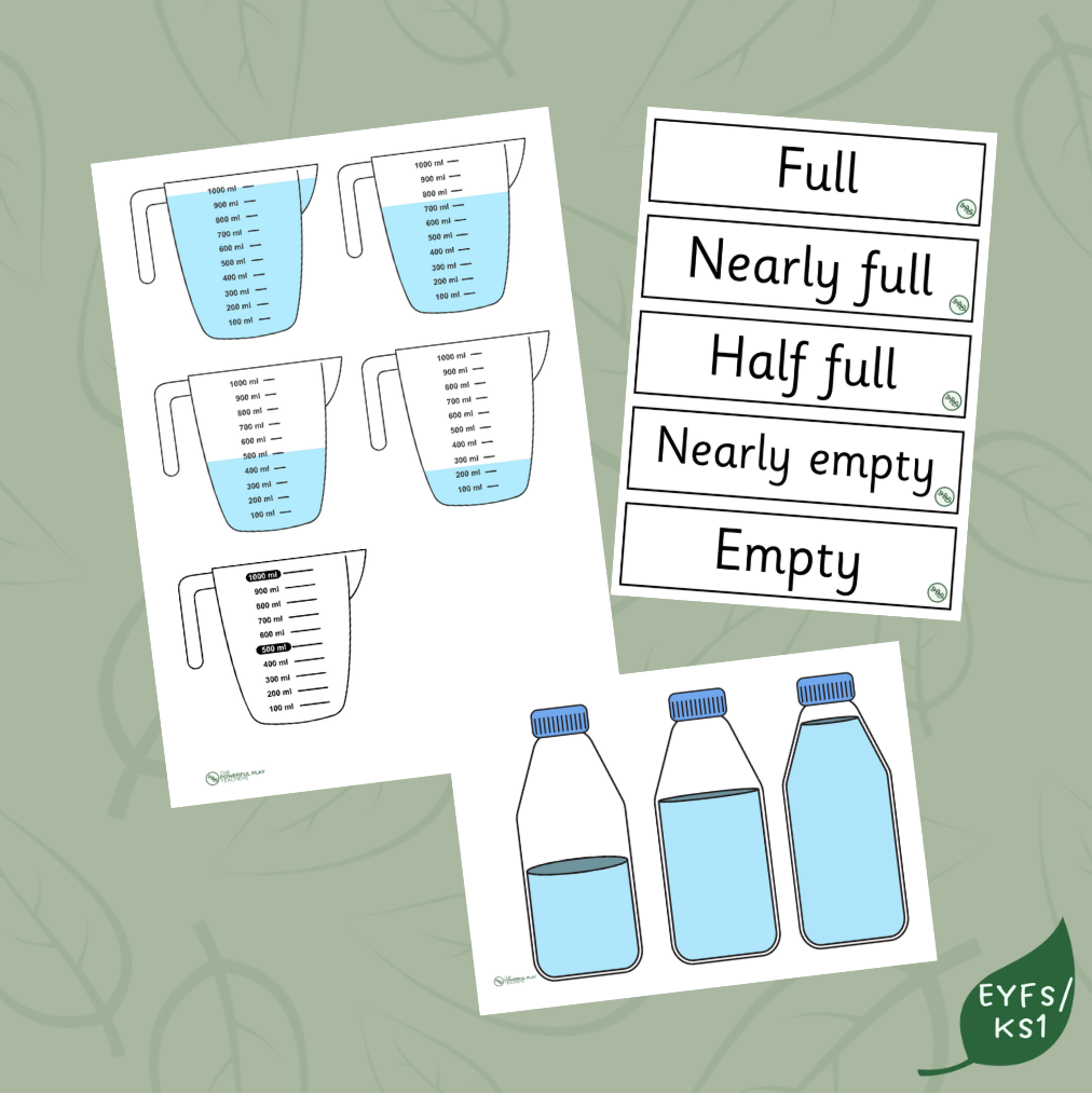 Match the images of the bottles with different amounts of liquid to the flashcards. Includes visuals of jugs with liquid to 1000ml.
