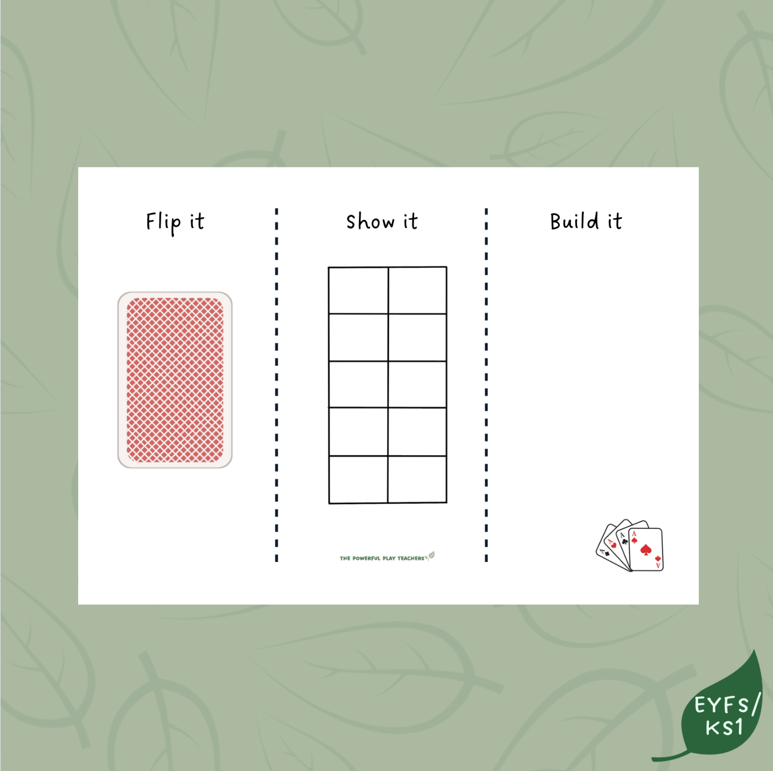 An engaging maths activity using playing cards. Place a playing card face down, flip the card over to reveal its value, then represent the number using the ten frame and physical resources.