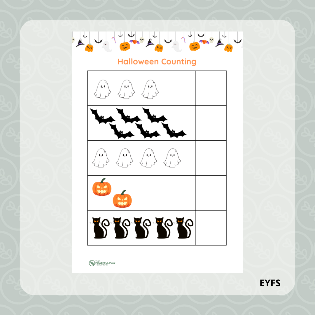 Count the amount of Halloween themed objects and write the quantity in the box. Includes counting up to 10.