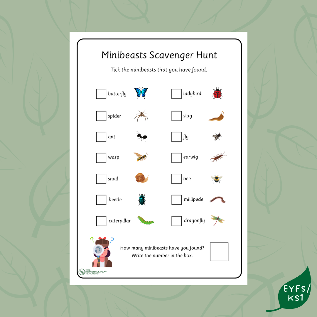 Complete the minibeast bug hunt on an outdoor area walk to see how many you can find. Includes a space to fill in the total number of minibeasts found.