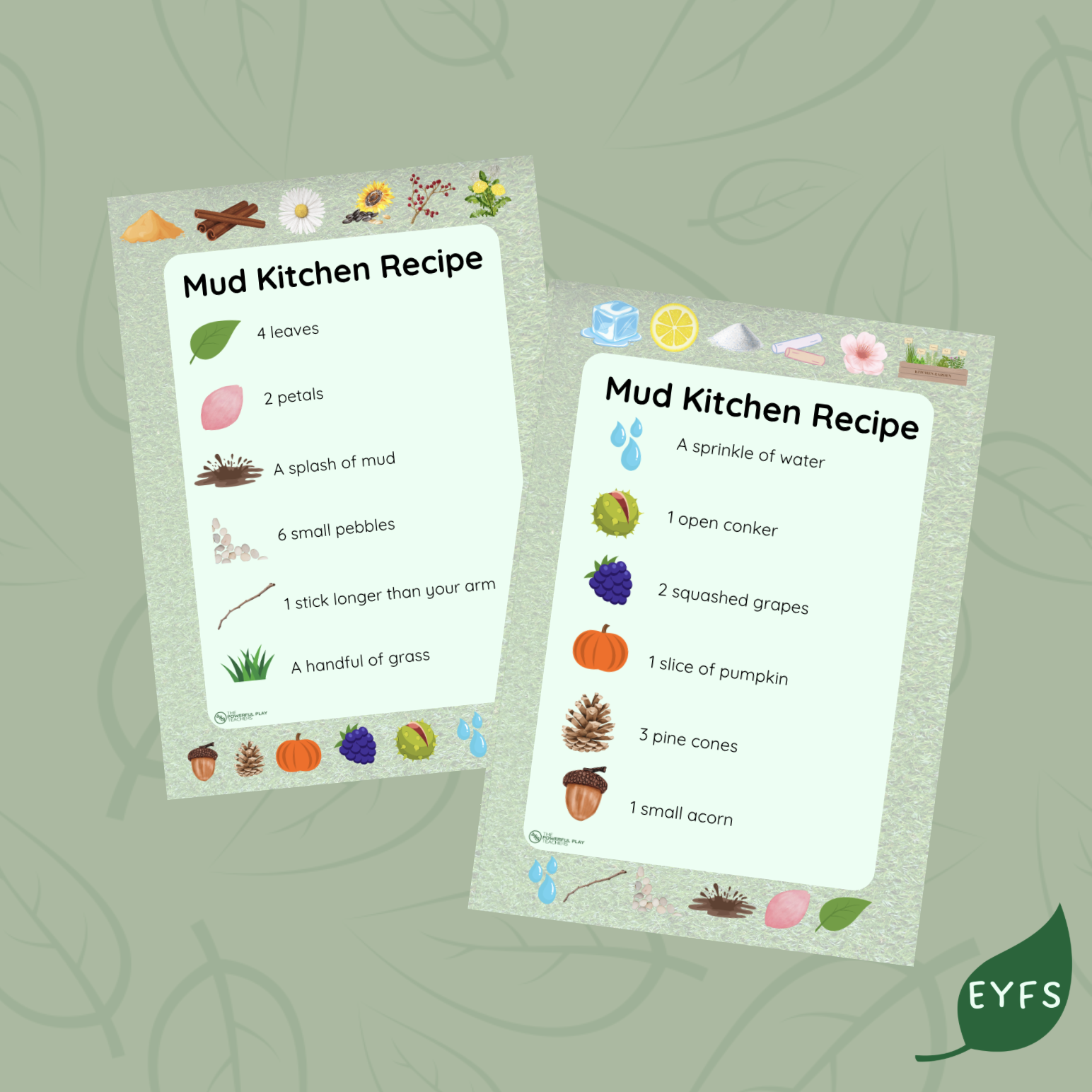 A set of 10 mud kitchen recipe cards including a range of different natural materials to make interesting concoctions: sticks, stones, fruit, seeds, mud and more! A great enhancement to any outdoor learning space to develop PSED, communication and language and maths skills all in one area.