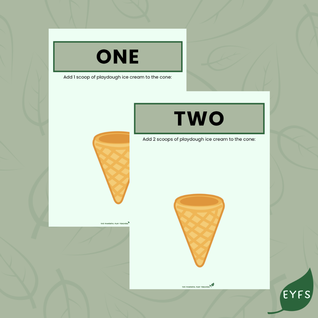 Numbered 1-10 ice cream cones. Add the correct amount of scoops to represent the numbers.
